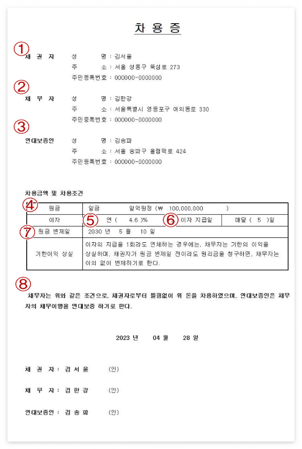 기본적으로 차용증에 넣는 항목들은 추가로 아래와 같습니다.