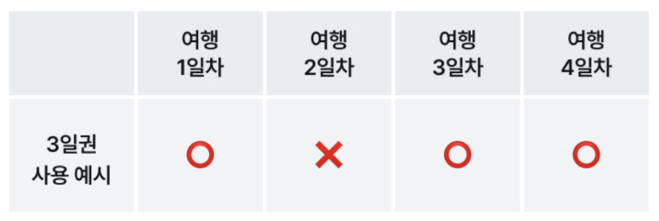 3일권을 사용했다고 가정했을 때, 아래와 같이 2일차는 사용하지 않을 수 있습니다.