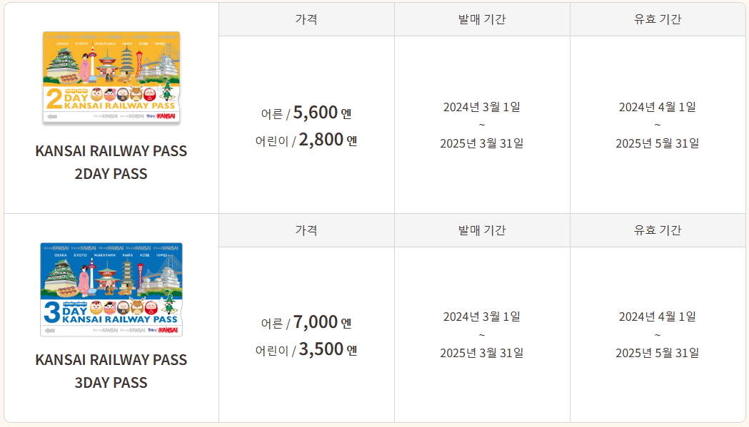 간사이 레일패스는 2일권과 3일권으로 구성이 되어있습니다.