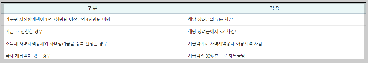 또한, 아래 조건에 해당하는 경우에는 지급액이 감액되거나 체납충당이 될 수 있습니다.
