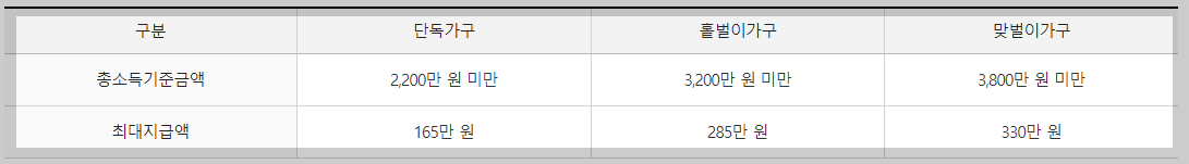 1) 소득요건 : 2023년 부부합산 연간 총소득이 가구원 구성에 따라 정한 아래 총소득기준금액 미만일 것
