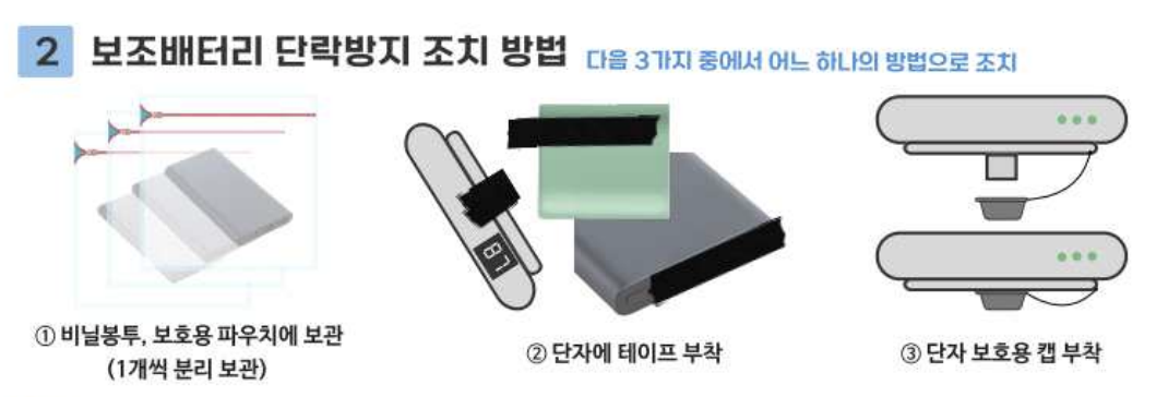 보조배터리의 단자가 금속에 닿지 않도록 단락 방지를 해야합니다.