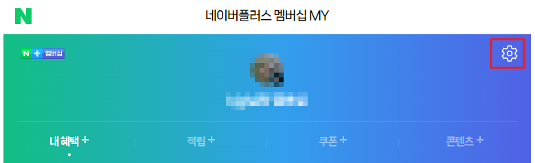 1) 네이버플러스 멤버십 메인 화면에서 아래 톱니바퀴 모양을 클릭해줍니다.