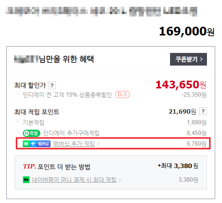 실제로 제품을 클릭해서 접속해보면, 이렇게 네이버 멤버십을 가입한 유저들에게만 추가로 적립을 해주고 있습니다.