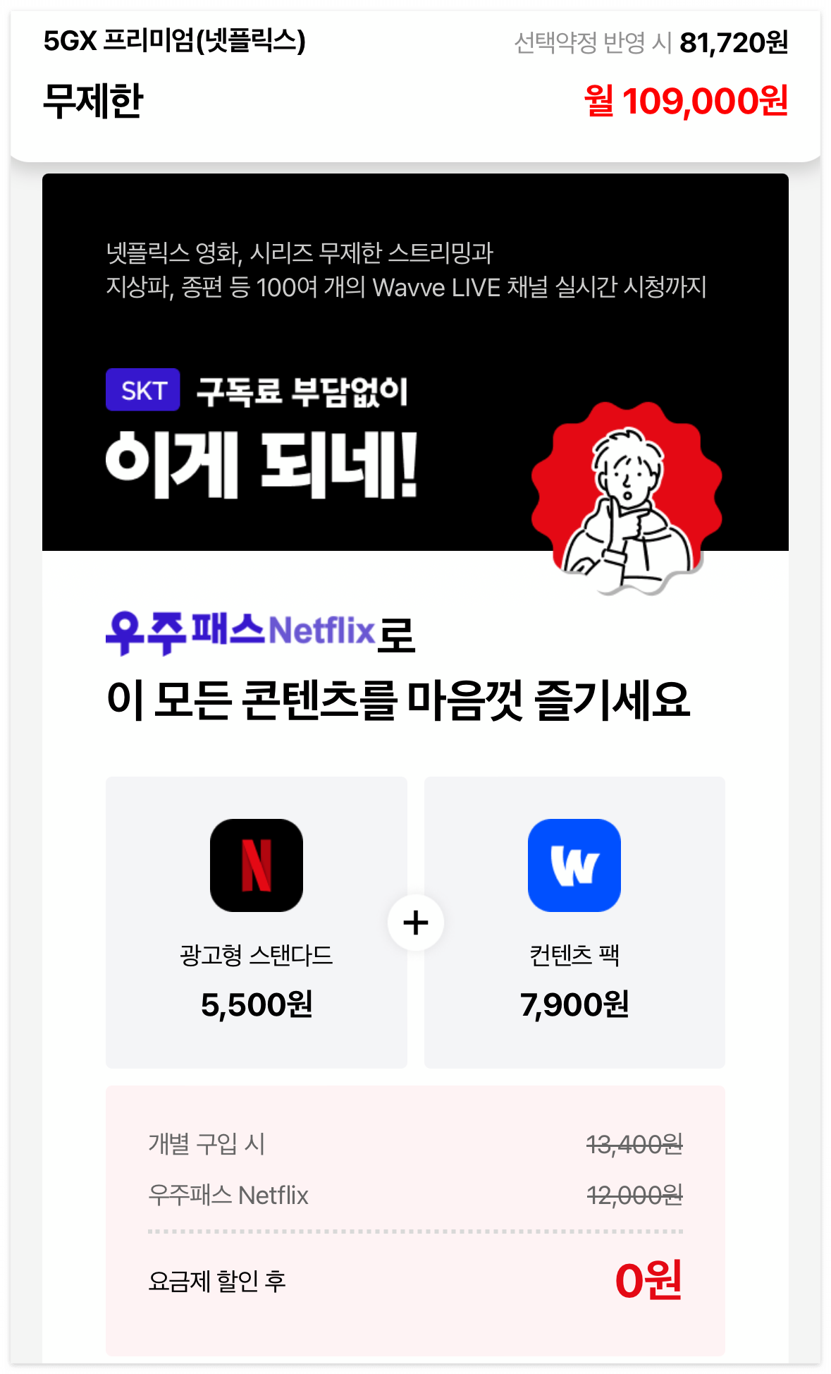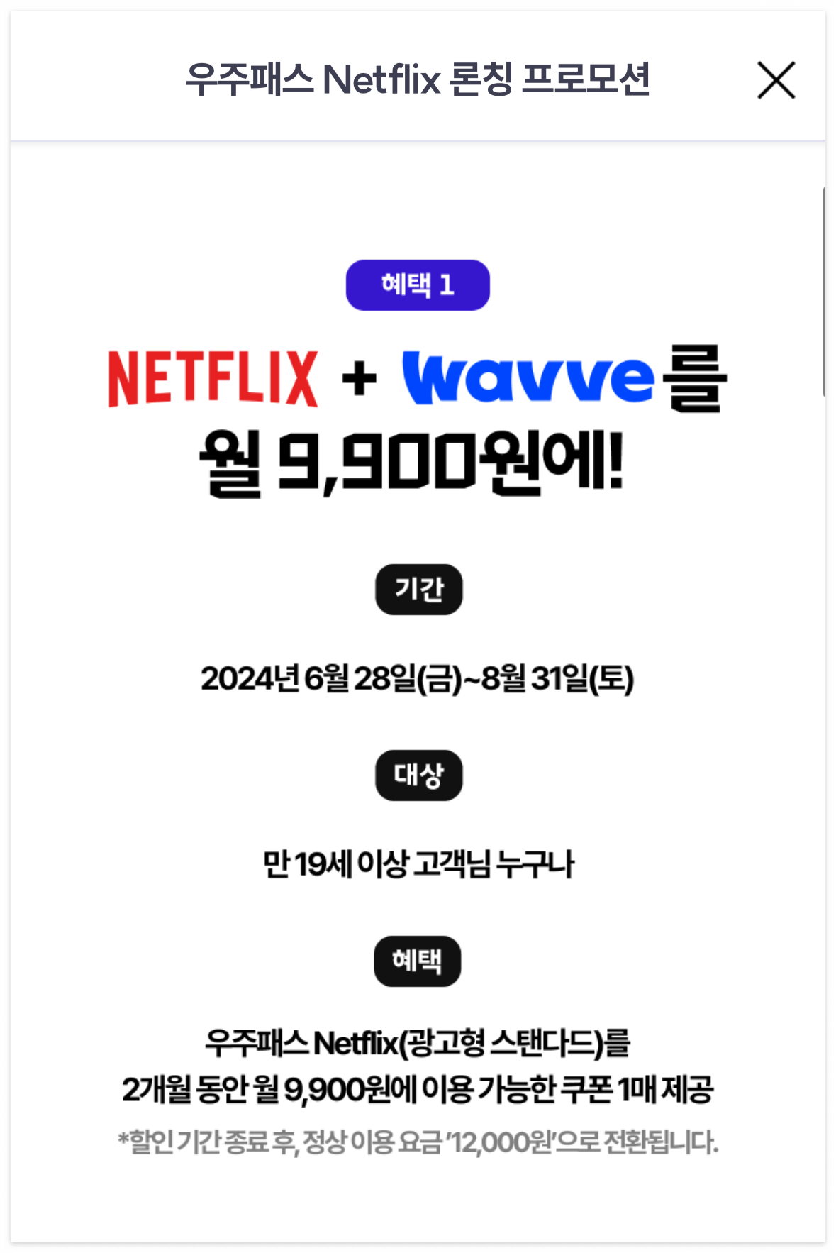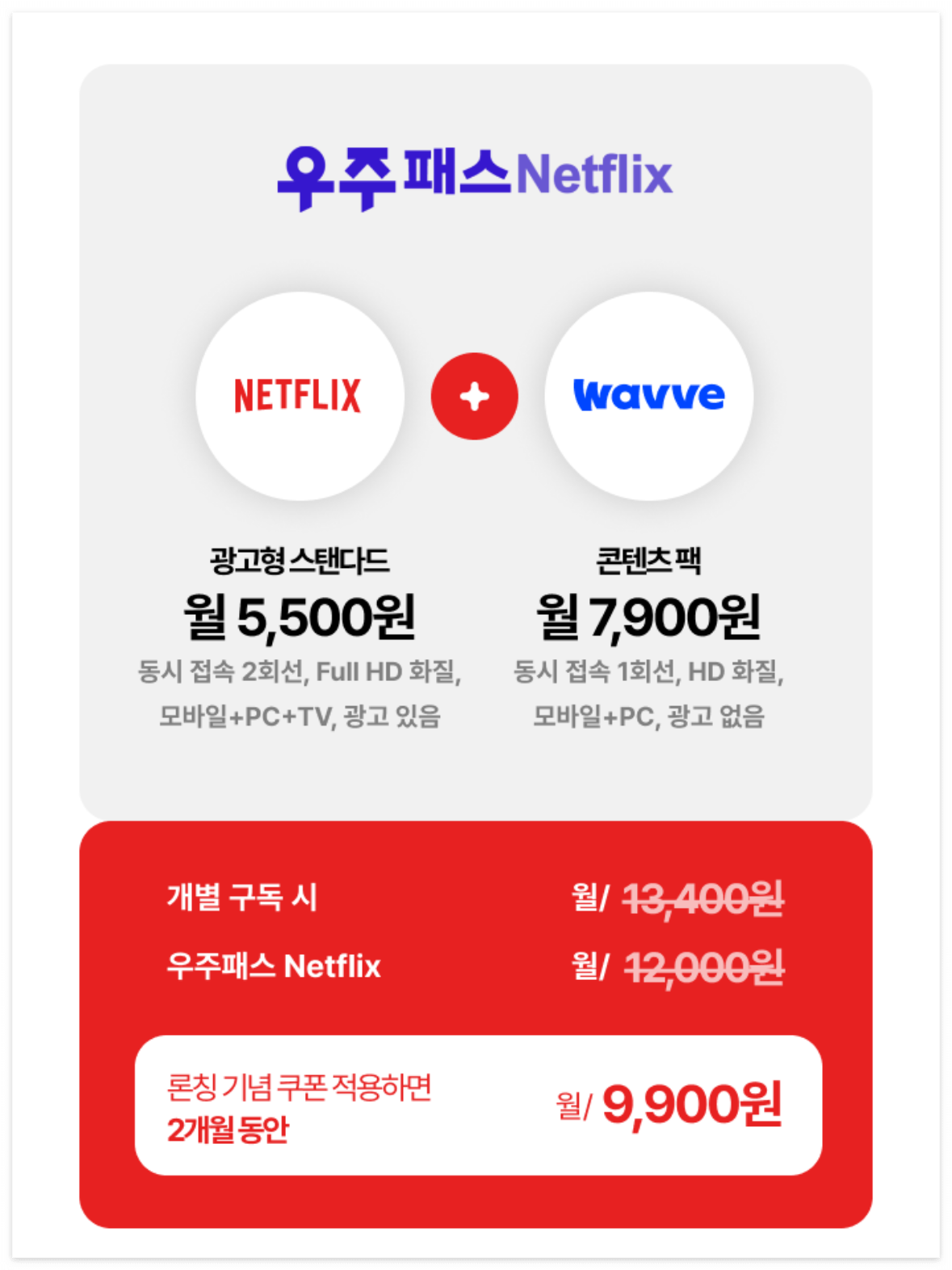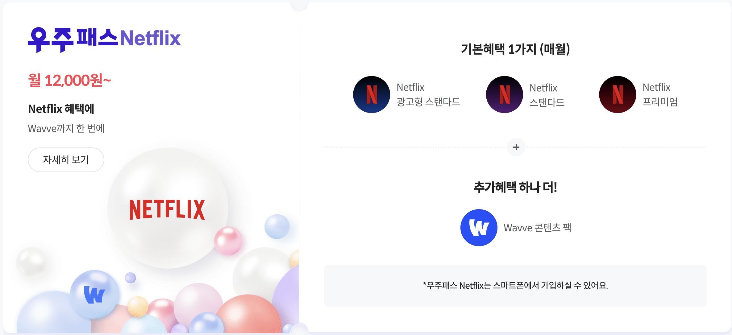 물론 Wavve를 포함한 가격이기에 만약에 netflix만 이용한다면, 우주패스보다는 netflix만 이용하는 것이 낫다고 할 수 있겠습니다.