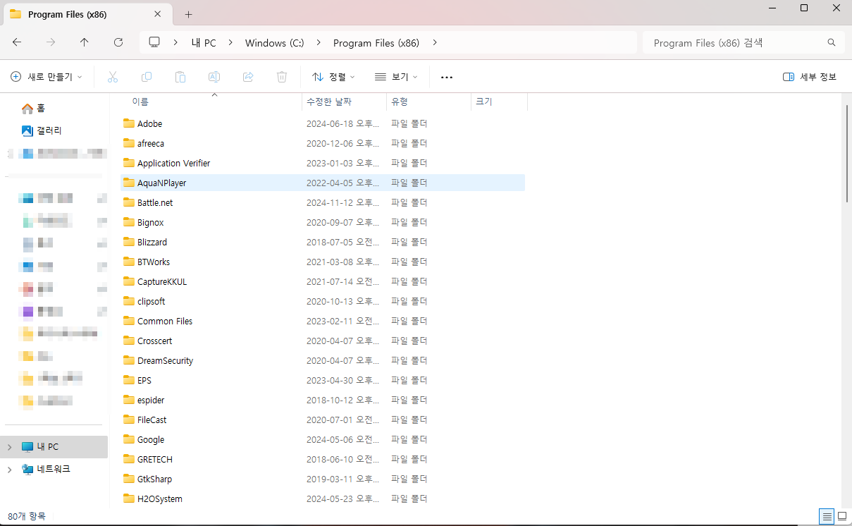 c 드라이브 -> program Files(x86) 으로 이동해서 아까 항목 2와 관련되어 있는 프로그램을 삭제해주시면 됩니다.