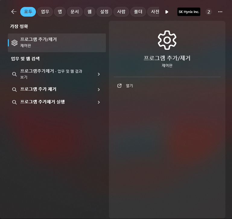 여튼, 왼쪽 하단에서 프로그램 추가 제거를 검색해줍니다.