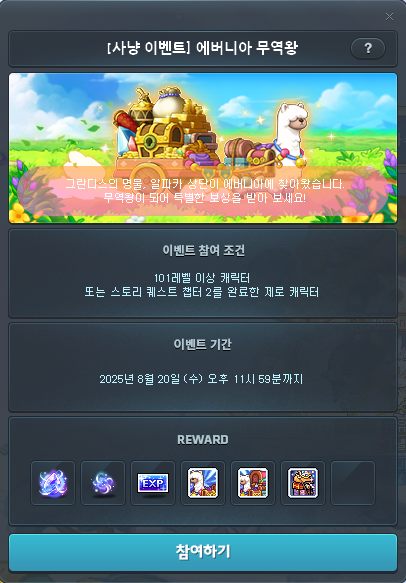 에버니아 무역왕 이벤트는 2025년 여름, '황혼빛 전야제'의 일부로 7월 17일부터 8월 20일까지 약 5주간 진행됩니다. 이 기간 동안 매주 총 3개의 알파카 상단을 운용할 수 있고, 총 15회의 무역 기회를 활용할 수 있어요. 참여 조건은 일반 캐릭터는 레벨 101 이상, 제로 캐릭터는 스토리 퀘스트 챕터 2까지 완료해야 하며, 이벤트 간소화 시스템을 통해 '참여하기' 버튼을 누르면 무역을 시작할 수 있답니다. 참고로 월드에 상관없이 자유롭게 상단을 보내는 게 가능해서, 여러 서버에서 동시에 진행할 수도 있어요. 단, 동시에 여러 상단을 운용할 수 없다는 점은 꼭 기억하세요!