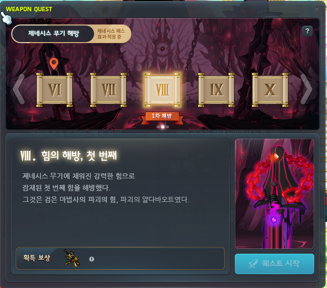 해방 퀘스트는 메이플스토리 내에서 왼쪽 퀘스트 알리미에 뜨는 "제네시스 북이 운명의 결전 그 후"라는 퀘스트로 시작돼요. 이 퀘스트를 클릭하면 자연스럽게 스토리 라인이 이어지고, 첫 번째 퀘스트는 자동으로 완료돼요. 그리고 곧 ‘봉인된 제네시스 무기 상자’를 받게 되죠.