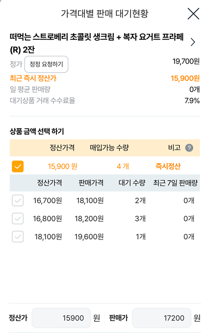 가격 버튼을 클릭해보니 이렇게 정산가격과 판매가격, 대기수량을 확인할 수 있습니다.