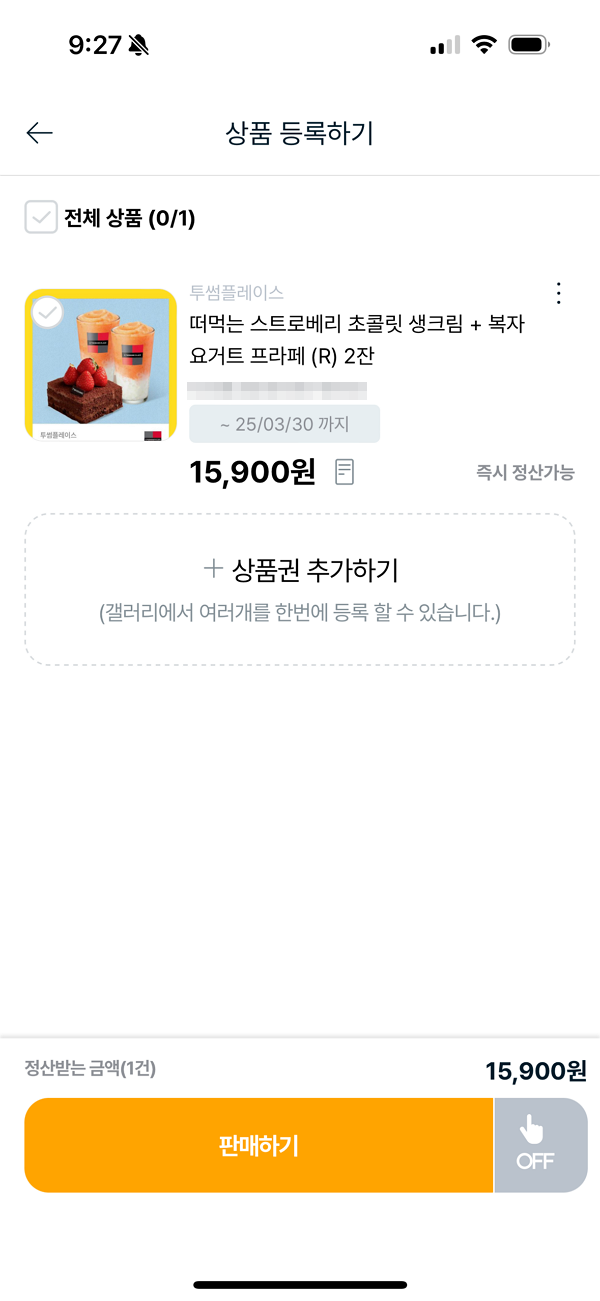 -. 판매 창으로 넘어가서 새 판매 시작 및 저장한 기프티콘 업로드