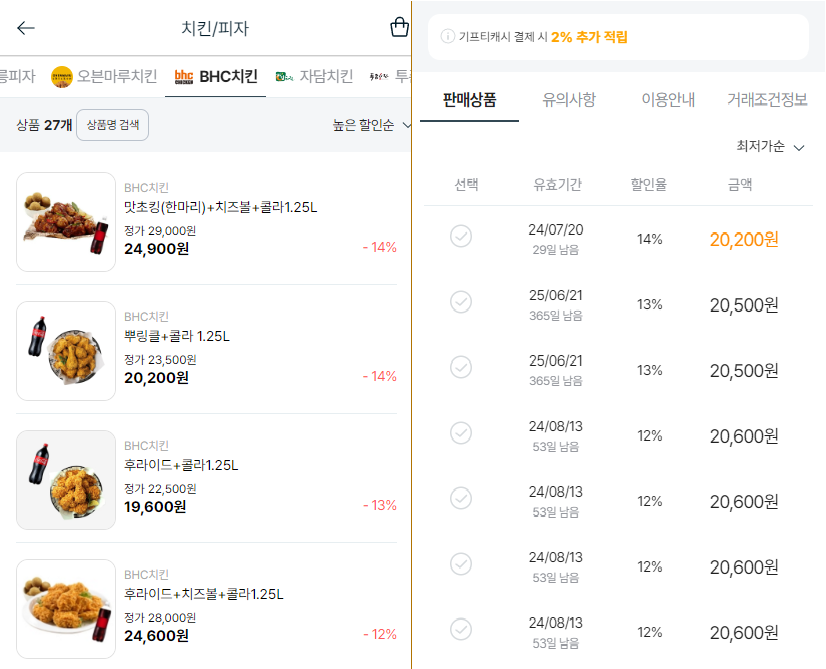저는  BHC의 뿌링클을 먹고 싶어서 선택해보았는데, 이렇게 유효기간과 할인율 금액별로 판매하고 있는 것을 볼 수 있습니다.
