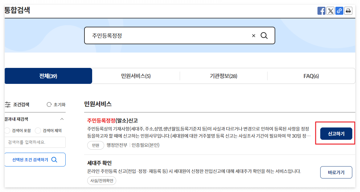 1) 정부 24 로그인 후에 주민등록정정 검색