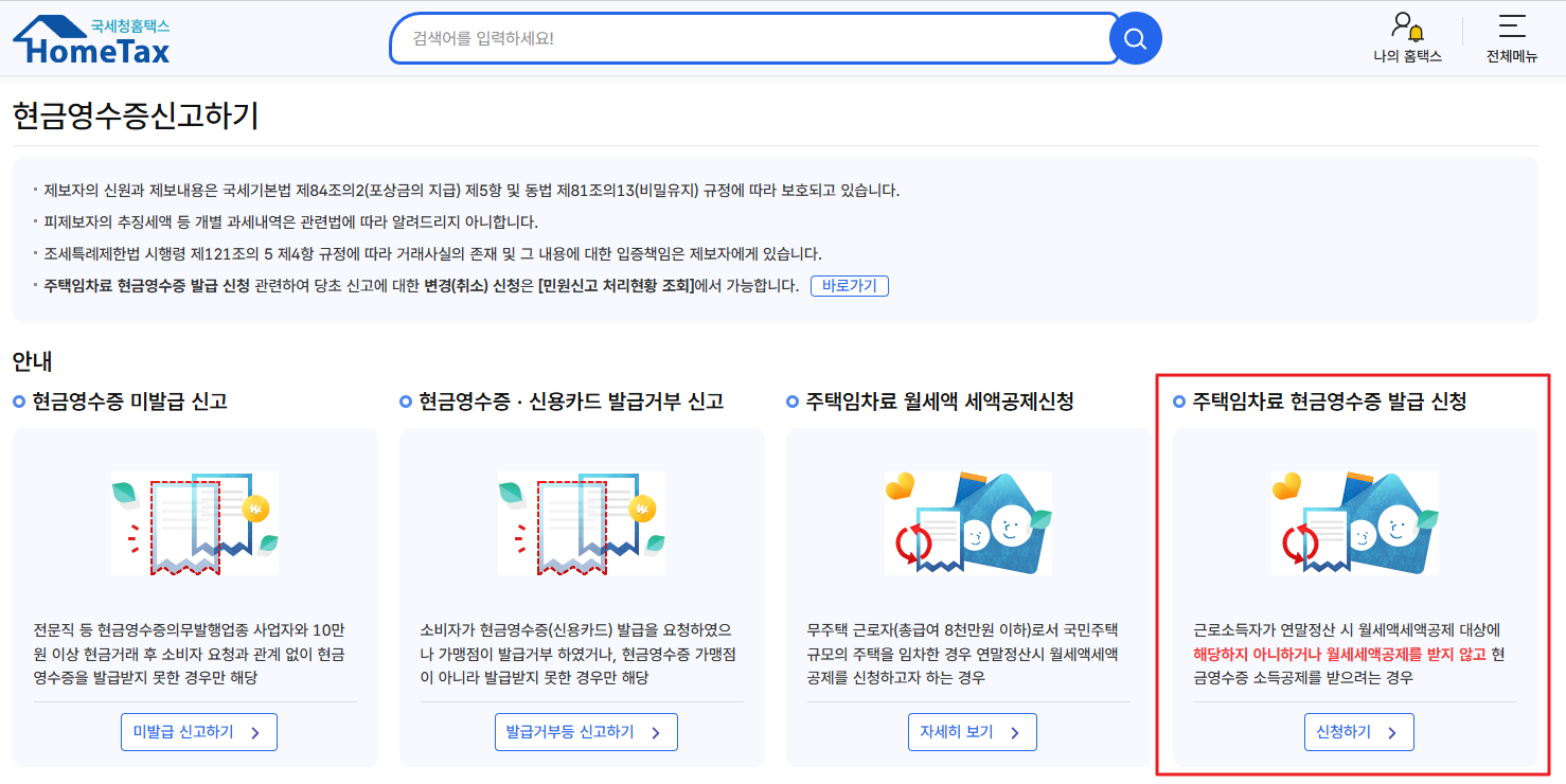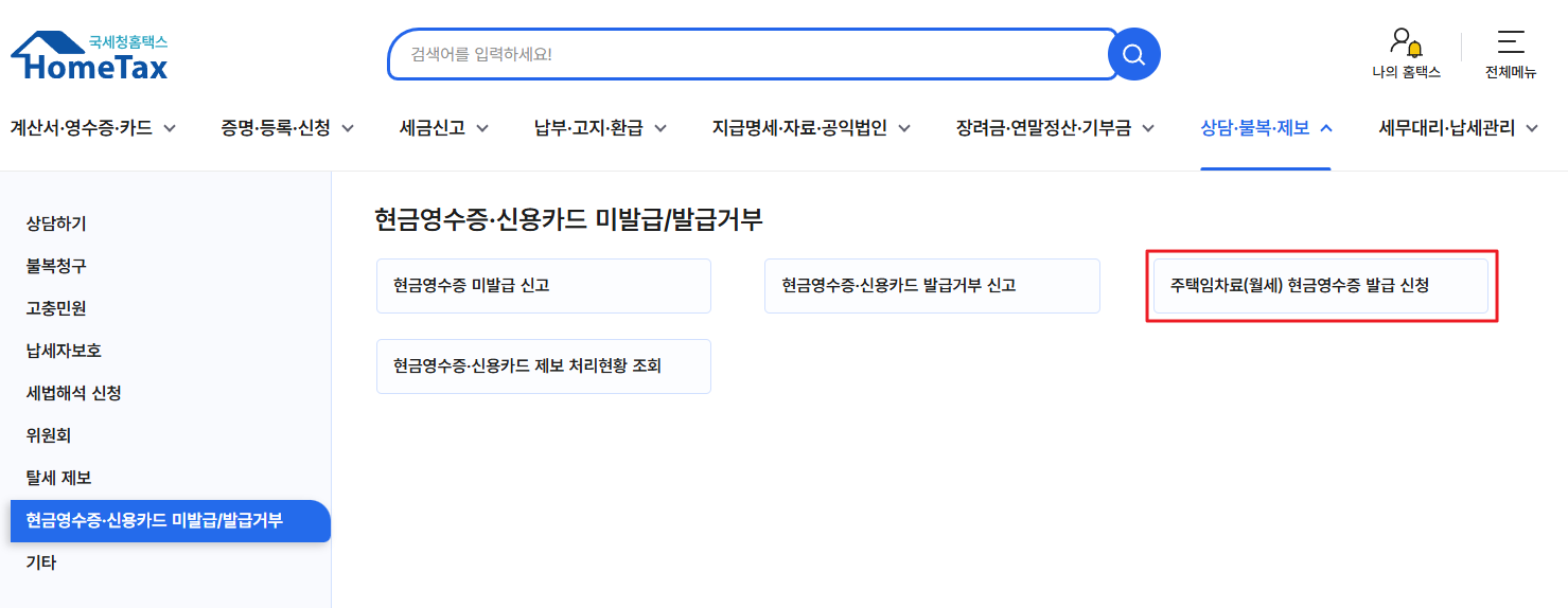 1) 홈택스 로그인 후, 주택임차료 현금영수증 발급 신청 클릭