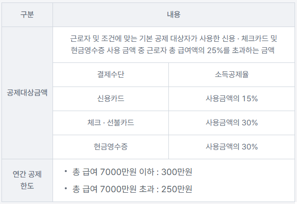 7천만원 이하는 300만원 / 7만원 초과자는 250만원이 소득 공제 됩니다.