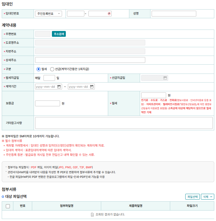 3) 월세 계약서상의 내용 기입 및 월세 계약서 업로드