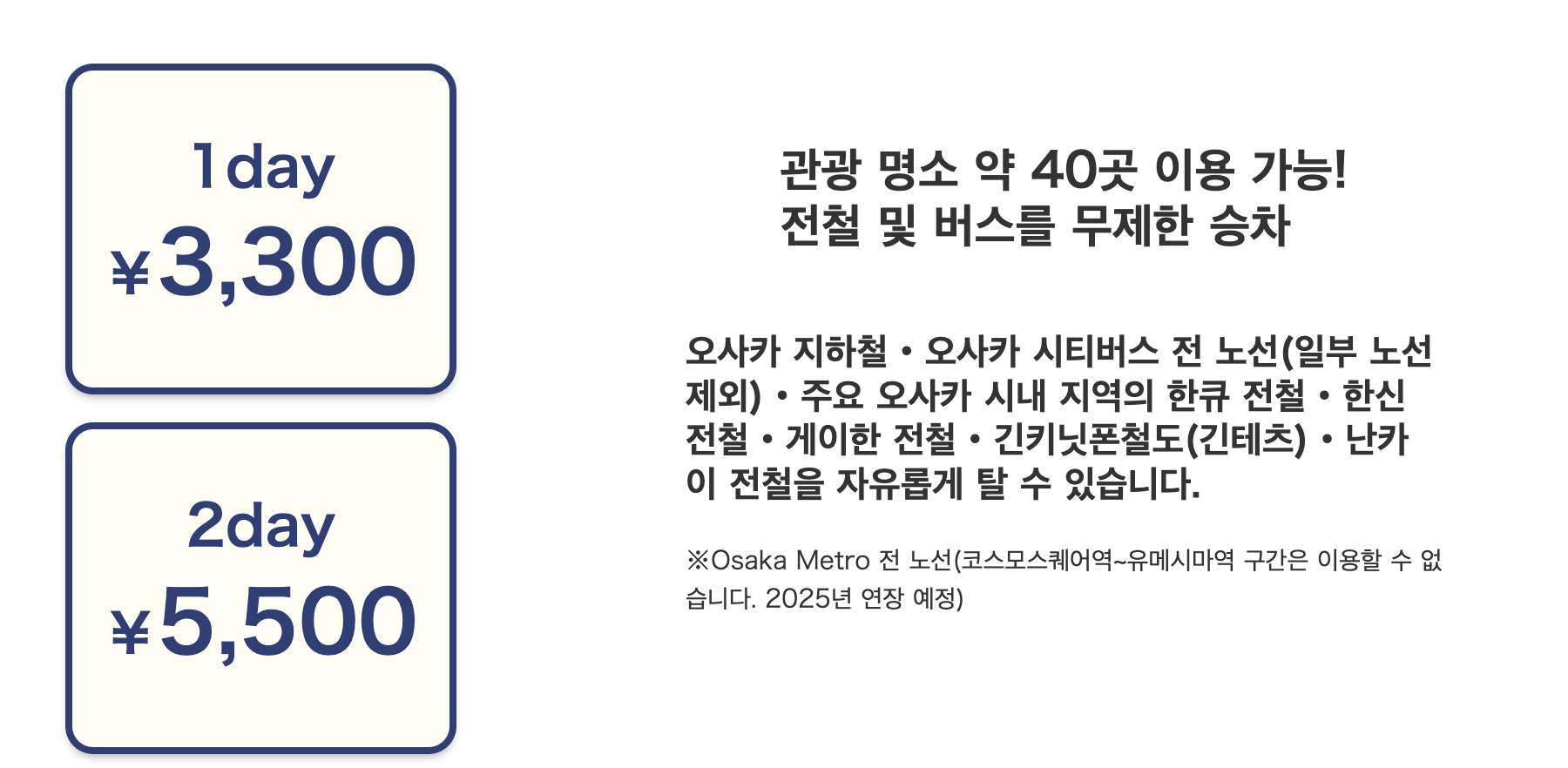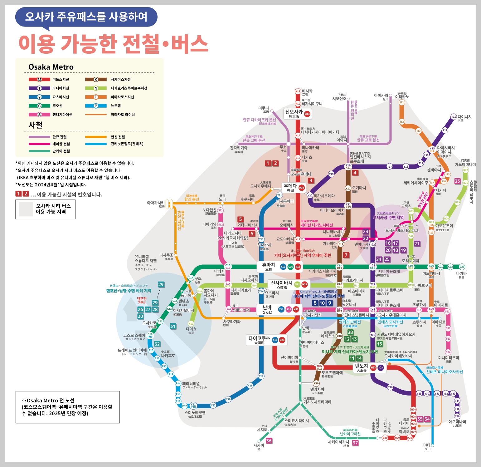 가장 먼저 오사카 주유패스는 오사카 매트로 & 사철, 버스까지 모두 무제한 무료로 이용 할 수 있습니다.