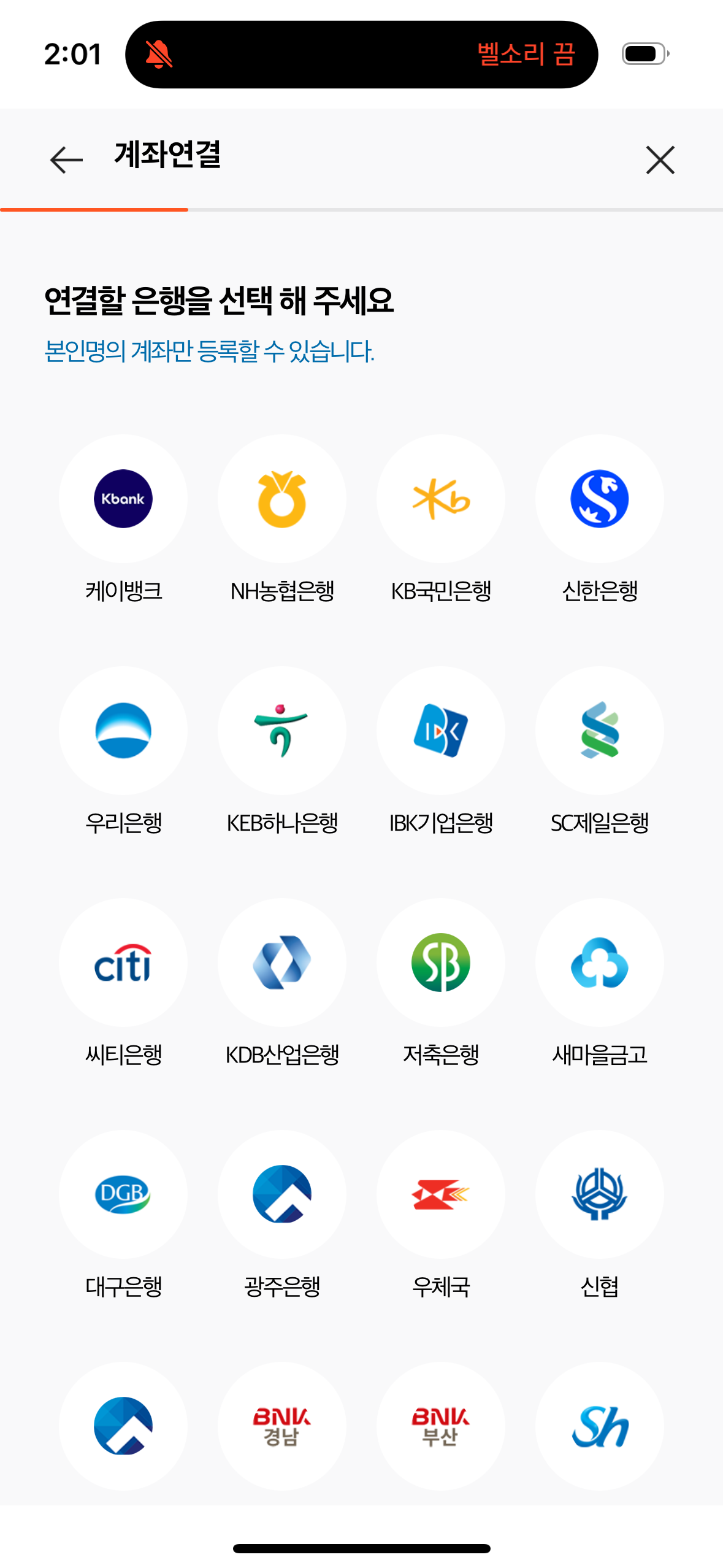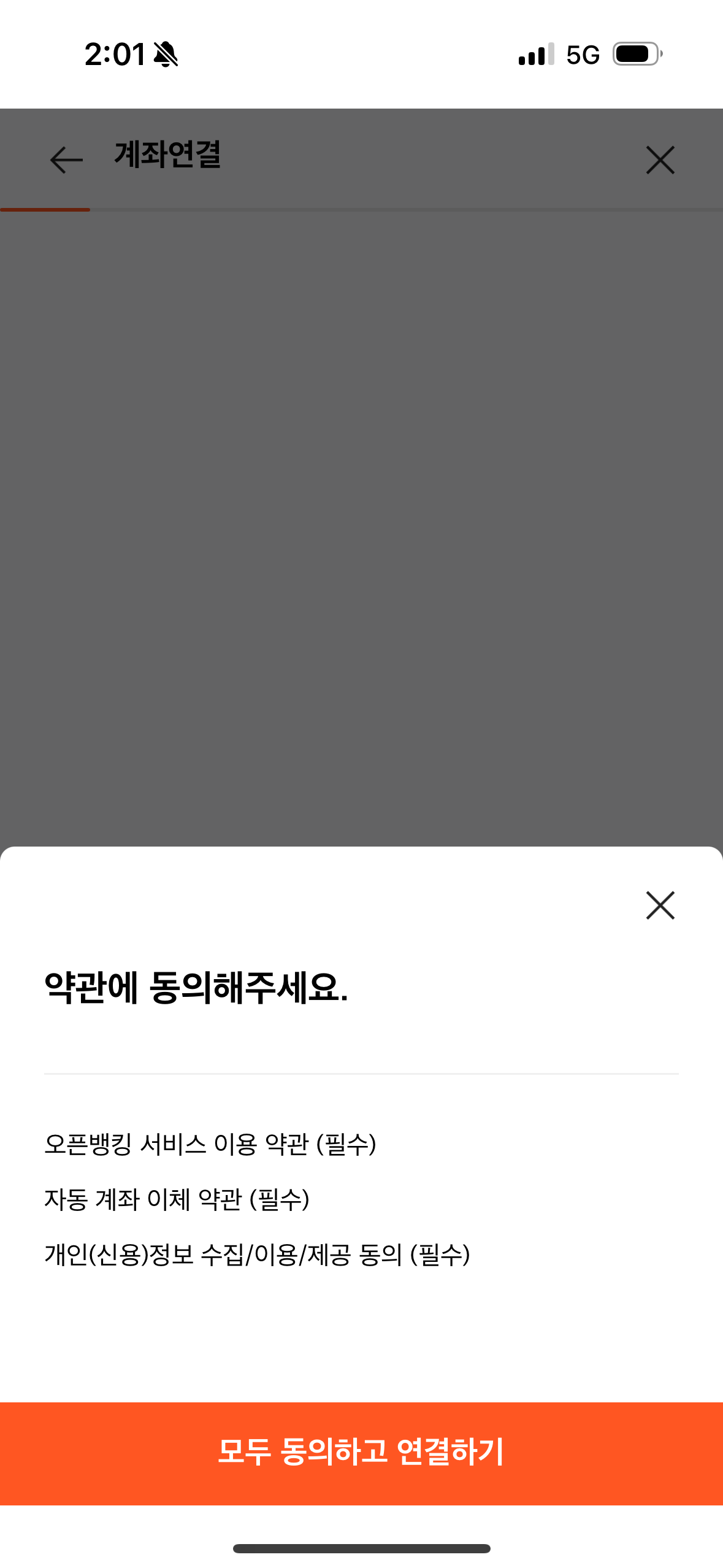 -. 앱을 설치한 후에 계좌 등록을 클릭해서, 약관 동의 및 연결할 은행을 선택해줍니다.