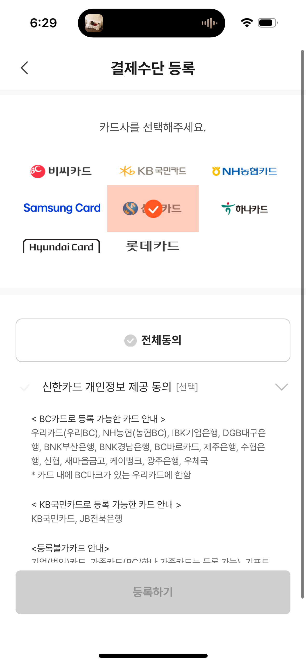 -. 메인화면에서 카드 등록을 클릭, 그 다음에 카드 등록을 클릭해서 원하는 카드사를 선택해줍니다.