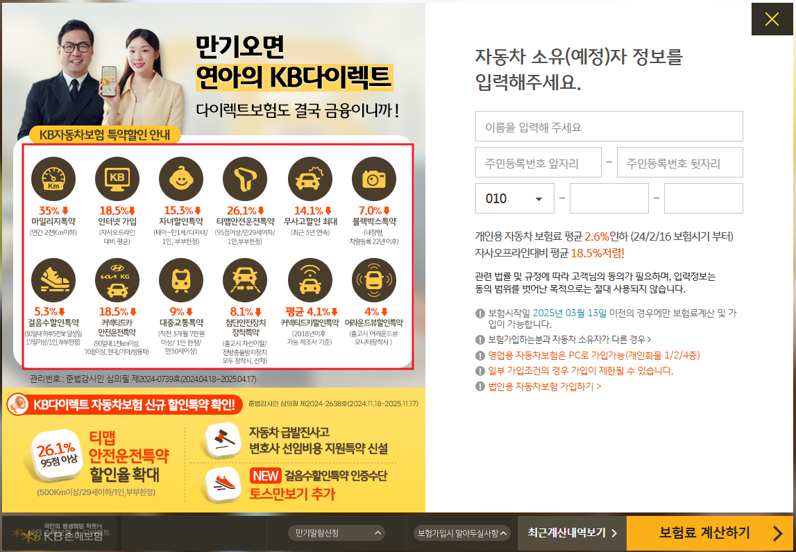 KB손해보험의 경우에는 마일리지 특약부터, 인터넷 가입시 할인, 걸음수 할인 등 다양한 할인이 있으니 해당 되시는 분들은 참고하시면 좋을 것 같습니다.
