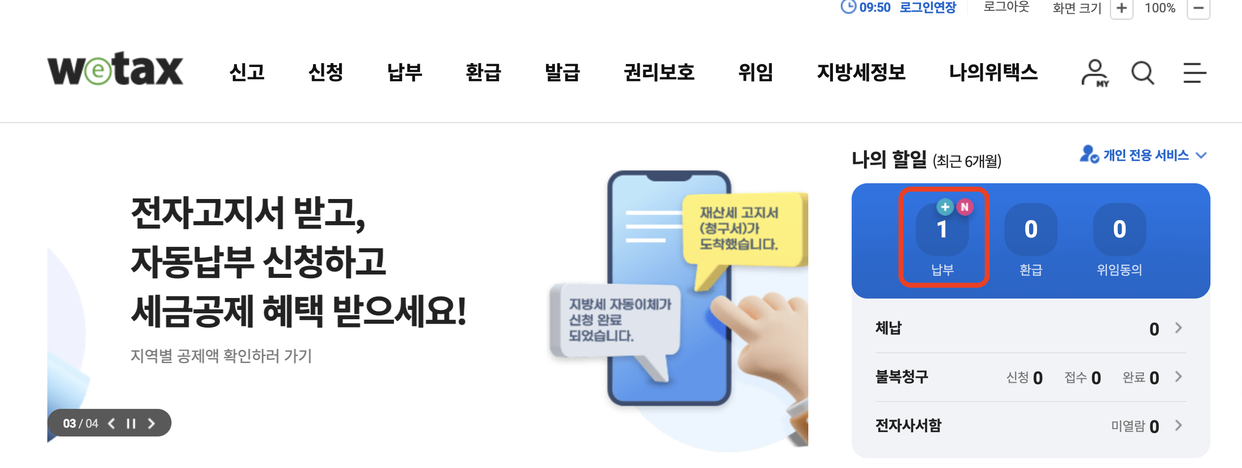 위 버튼을 클릭해서 위택스에 접속하신 후에 로그인을 진행하시면, 아래와 같이 납부 버튼을 클릭해주시면 됩니다.
