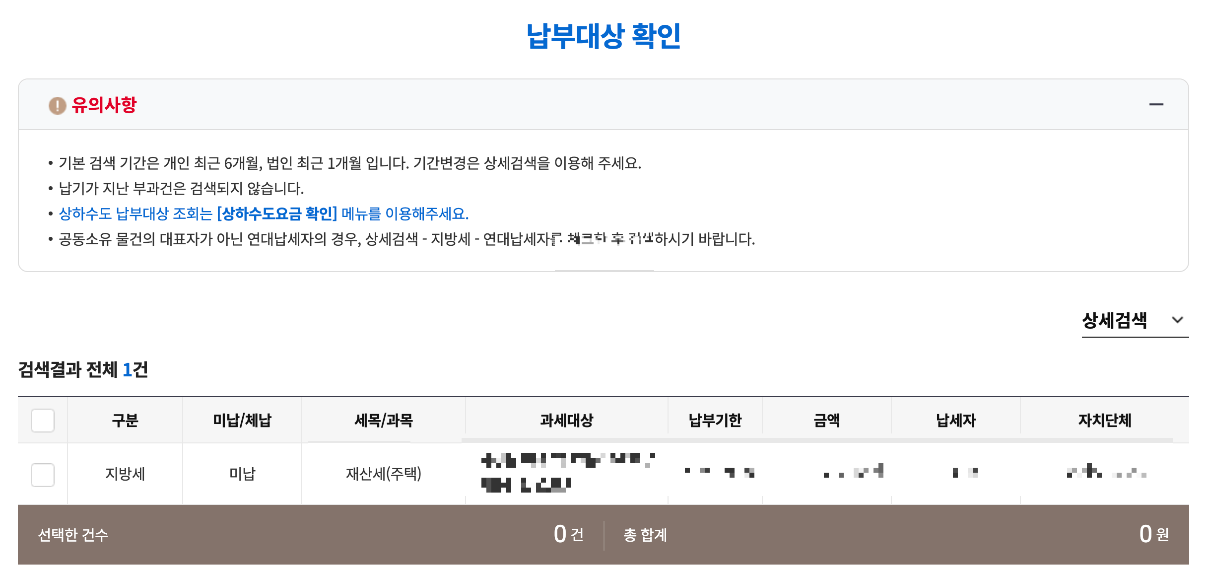 지방세 - 재산세가 현재 미납된 상태인 것을 확인할 수 있습니다.