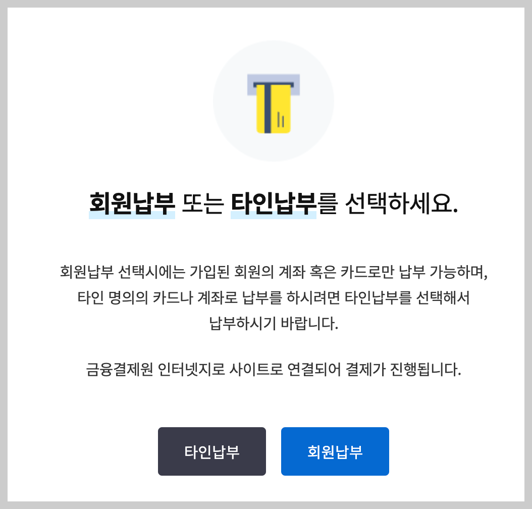 그러면 이제 회원납부 혹은 타인납부 화면이 나오는데, 배우자의 경우에는 타인 납부를 할 수 있겠죠?