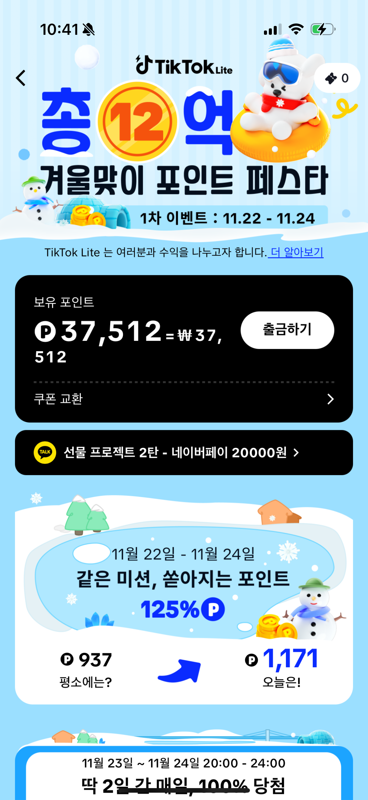 여기에 추가로, 출석 체크, 동영상 시청, 친구 추천을 통해서 수익까지 창출할 수 있는 앱테크 버전이라고 할 수 있습니다.