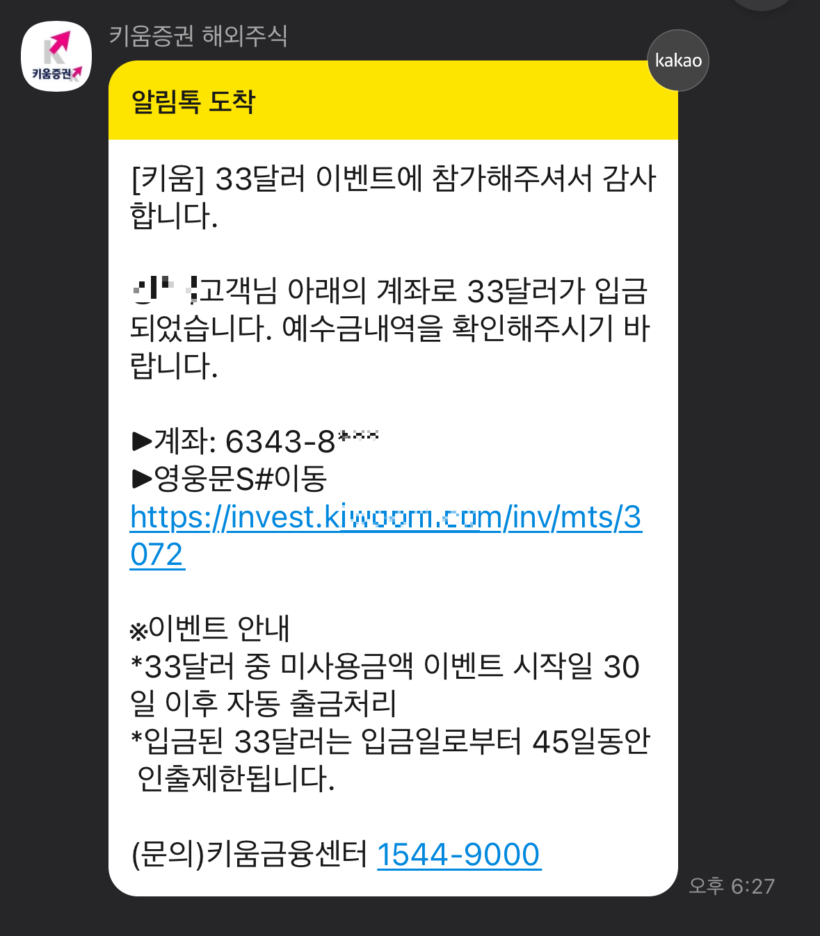 신청 하게 되면 신청계좌로 $33가 입금되는데, 이를 30일 이내에 미국주식 매수금으로 사용하면 됩니다.