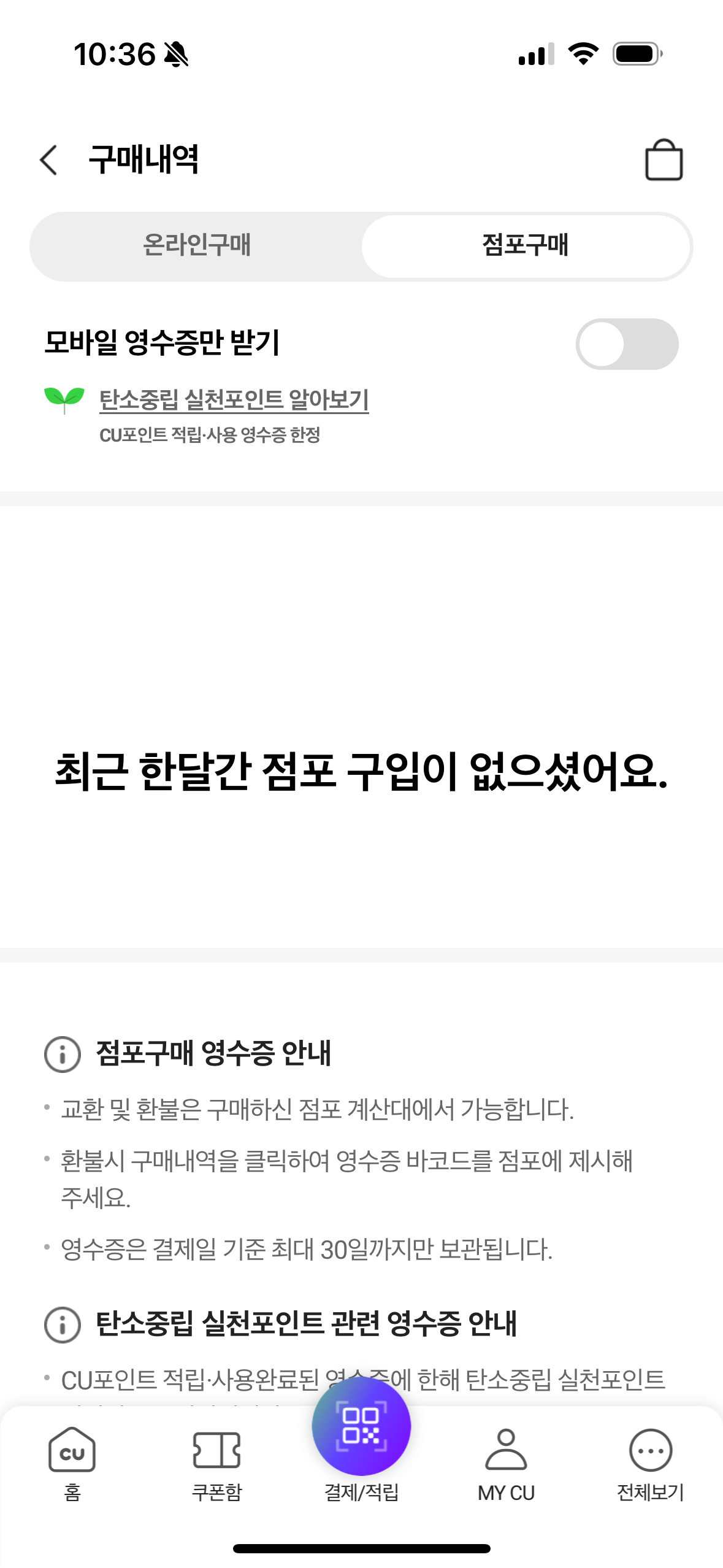 -. [MY CU] - [구매내역] - [모바일 영수증만 받기 활성화]