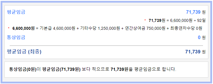 아래와 같이 평균임금이 계산이되고, 만약 퇴직금을 받게되면 아래 평균임금을 기준으로 산정을 할 수 있습니다.