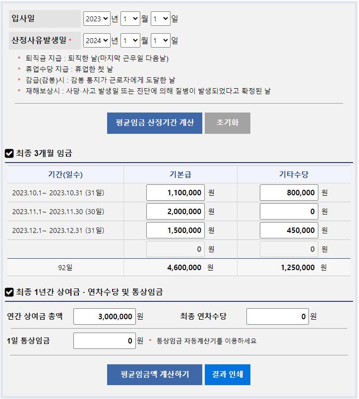 입사일과 산정사유발생일, 기본급,수당, 상여금은 아래와 같이 가정을 해서 계산을 해보았습니다.