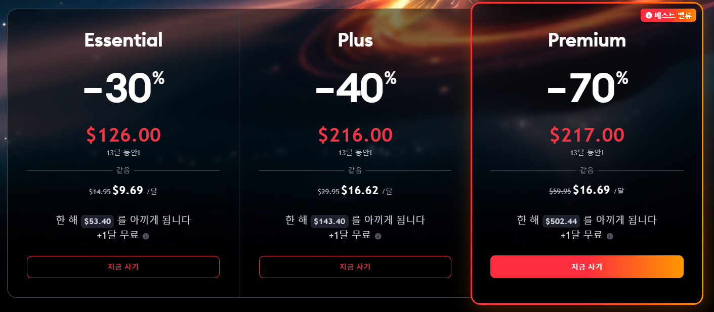 Essential 은 30% / Plus 는 40% / Premium 은 70% 로, 이번 블프 때 최대 70%의 혜택을 받을 수 있습니다.