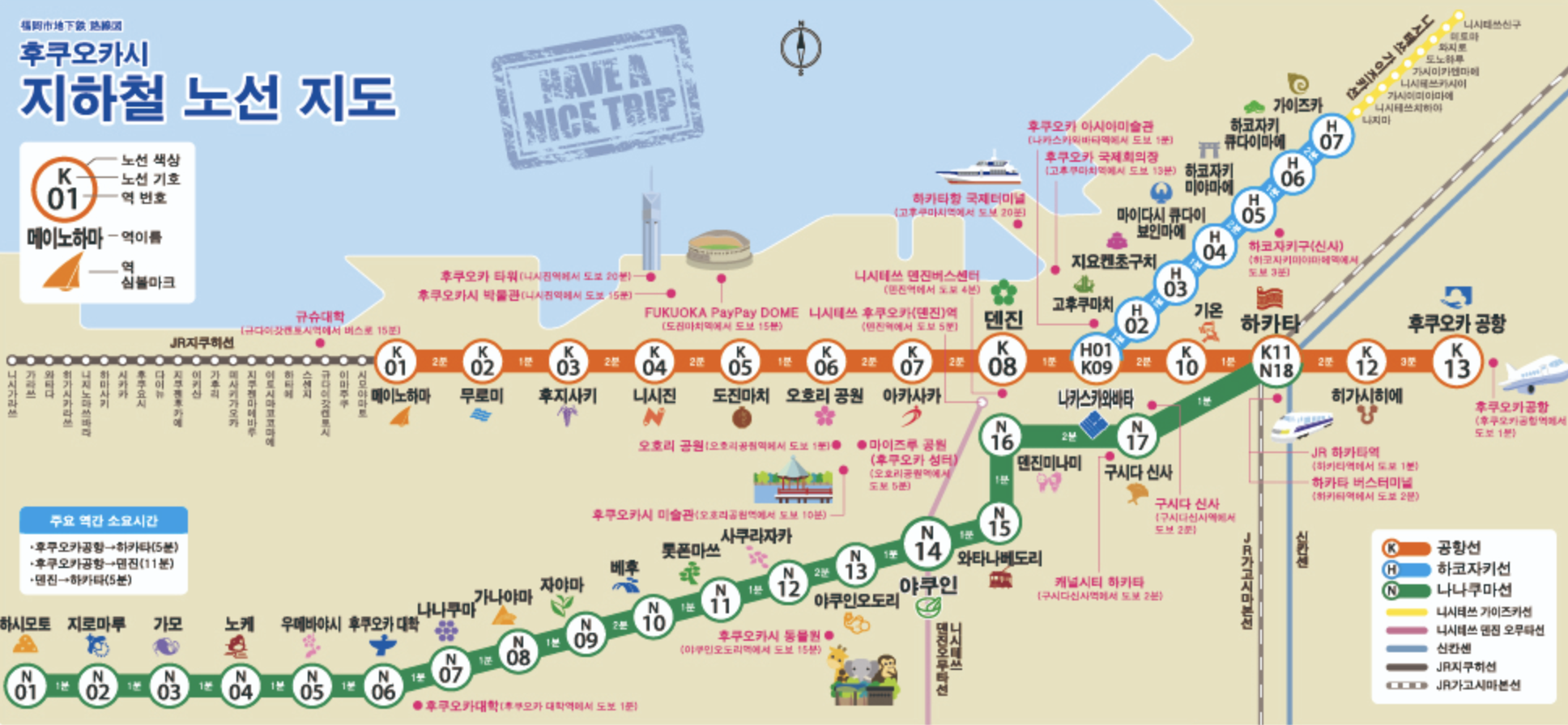 소요시간은 하카타역까지 20분 / 텐진까지는 40분 정도 소요됩니다.