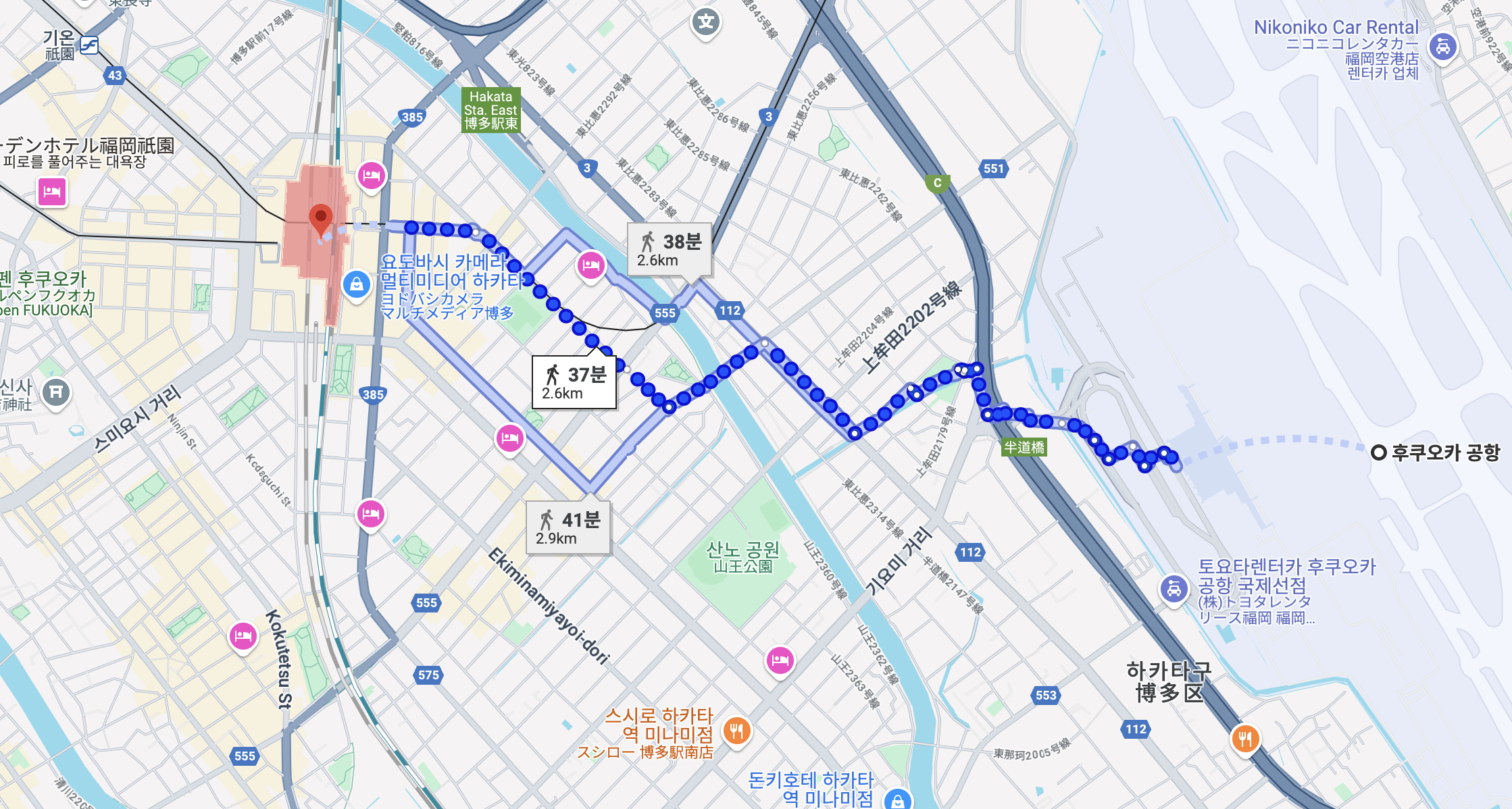 텐진까지는 좀 멀지만, 하카타역까지는 40분 정도면 가기 때문에 주변 구경도 하고 산책을 하면서 걸어가는 것도 괜찮겠죠?