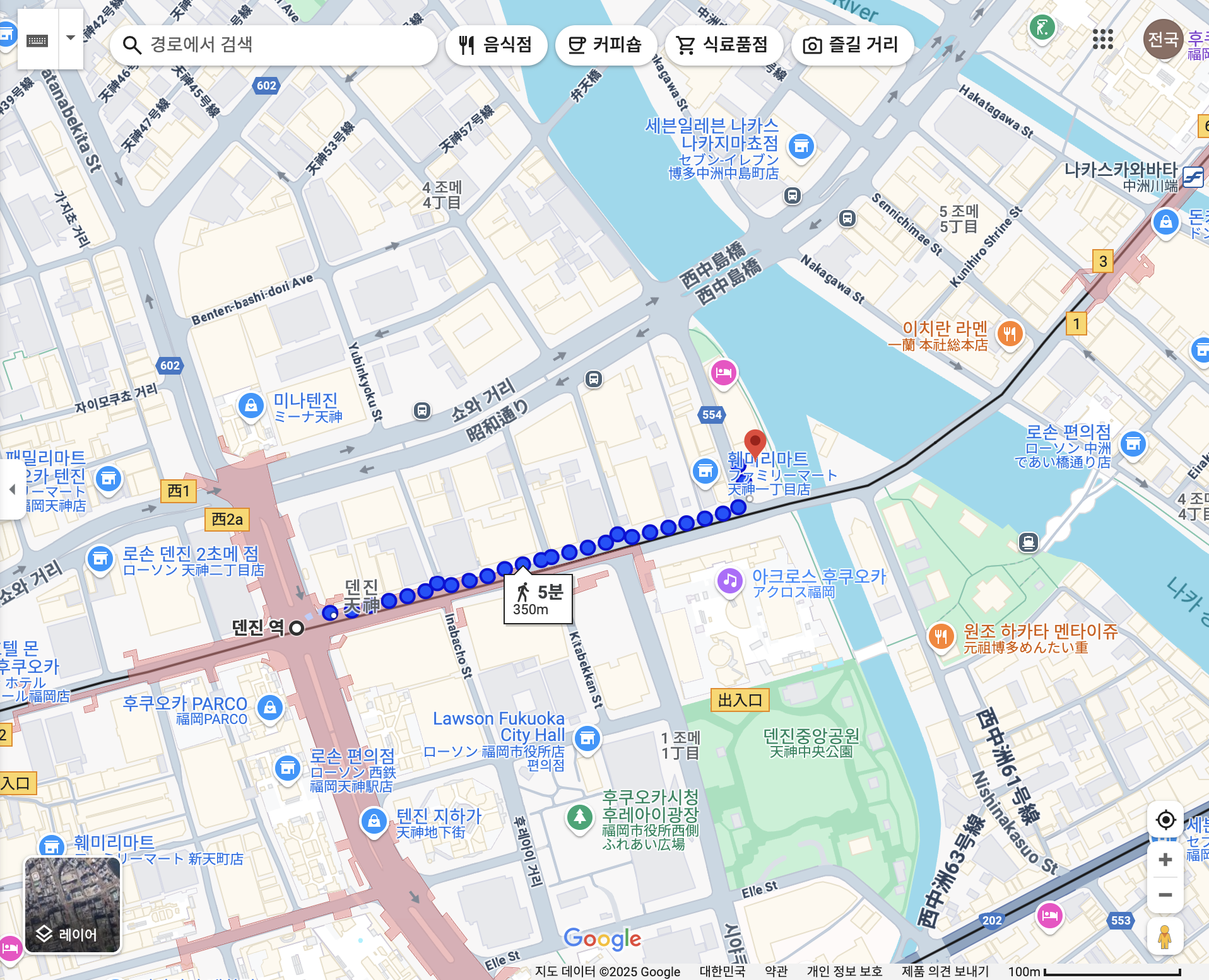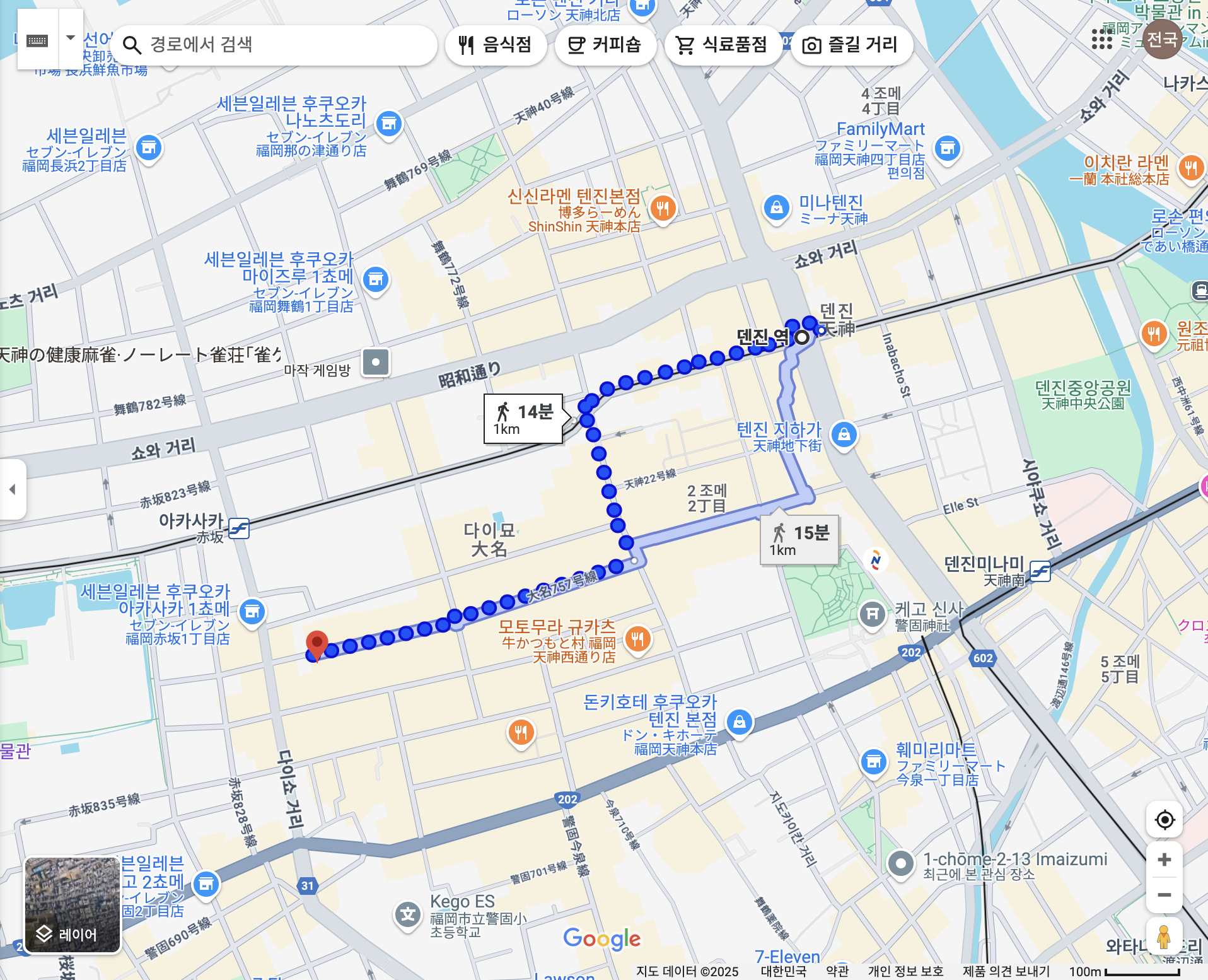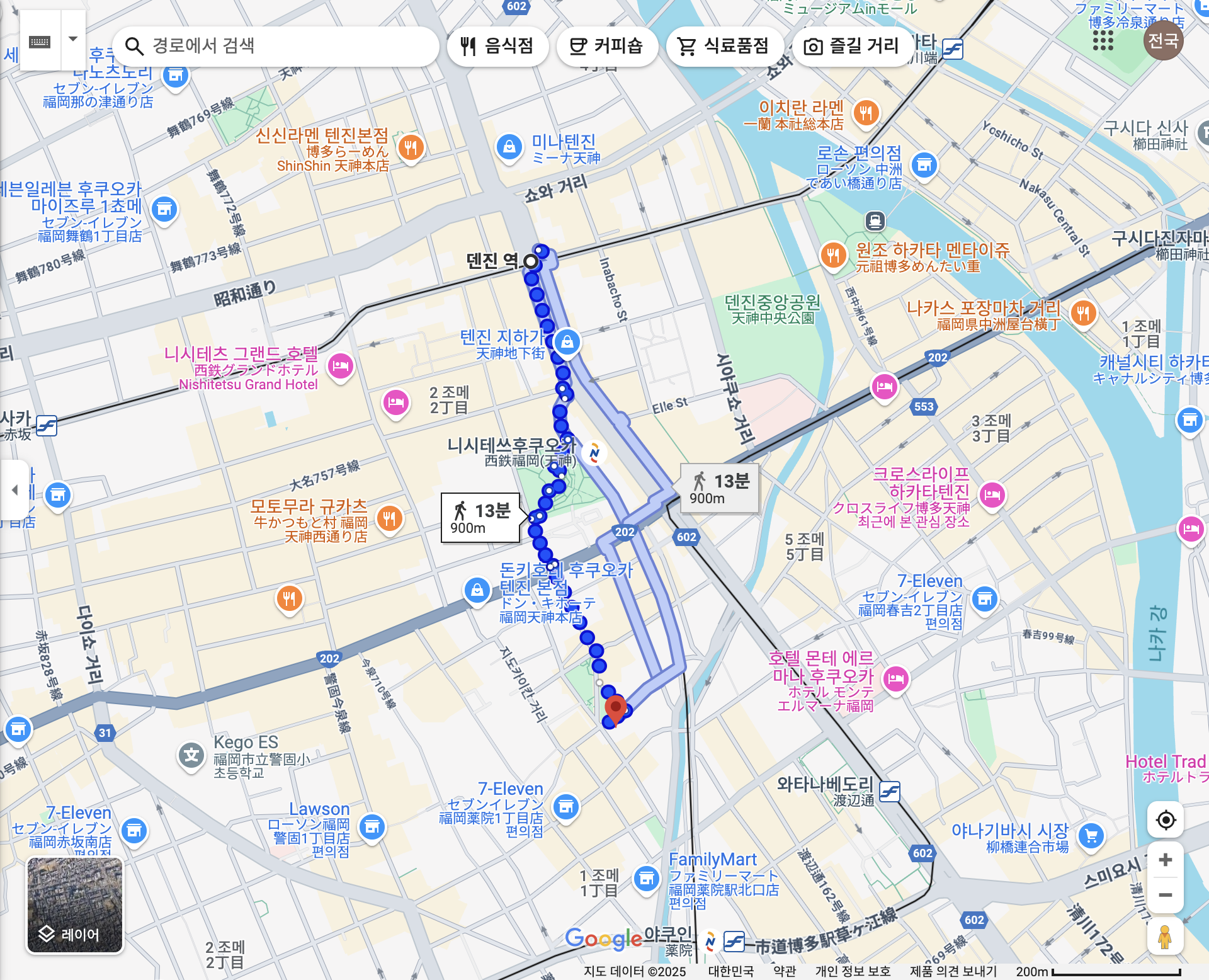 덴진역에서 도보로 900m 약 13분 정도 걸어가면 도착할 수 있는 거리에 위치해있습니다.