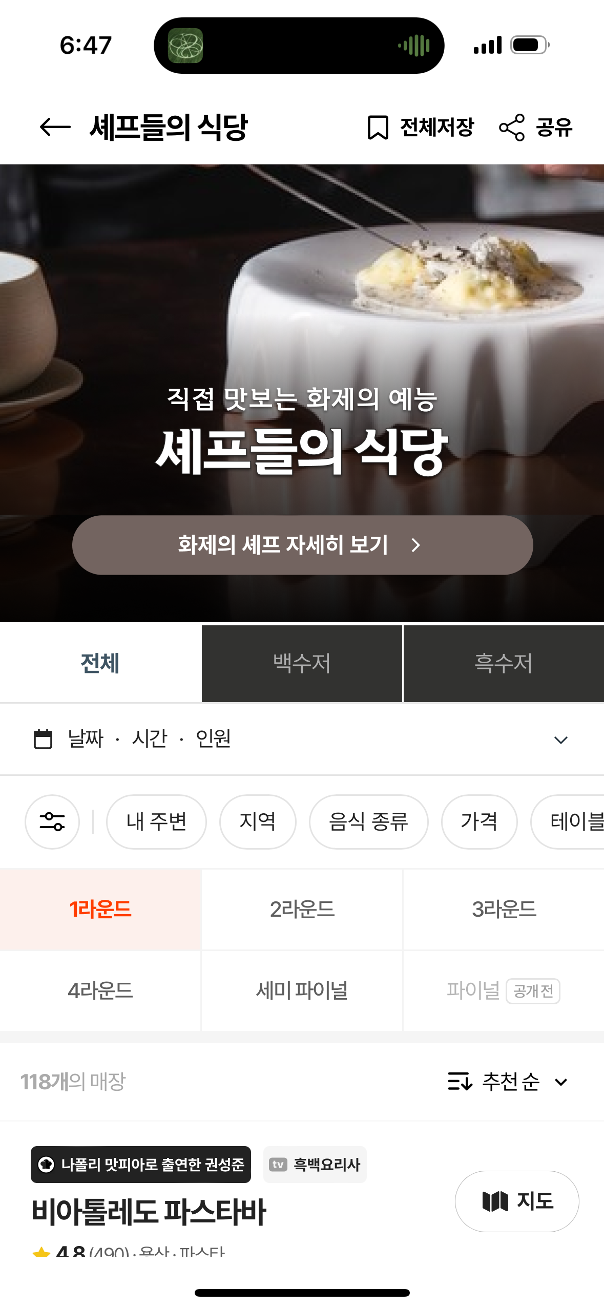그리고, 화제의 셰프 자세히 보기를 클릭하면 내가 원하는 셰프의 식당 또한 바로 확인을 하실 수 있습니다.