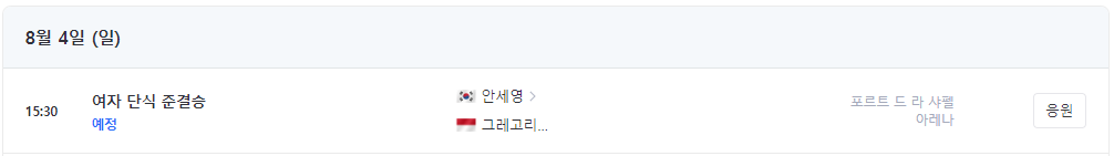 8월 4일 일요일 단식 준결승전 안세영 선수 경기가 남아있습니다.