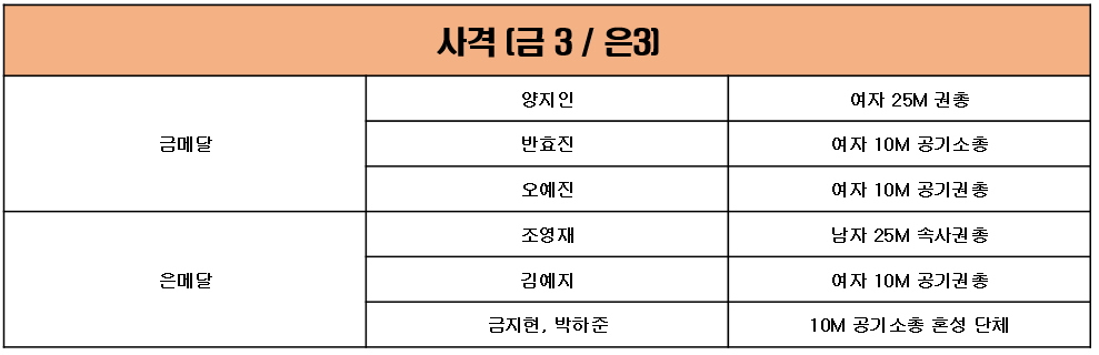 사격에서는 금메달 3개, 은메달 3개로 6개의 메달을 획득했습니다.