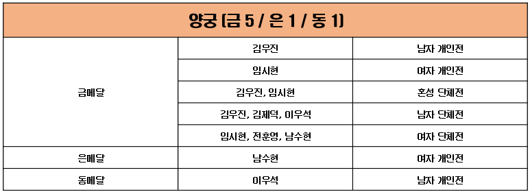 양궁 5개 종목에서 전부 금메달을 가지고 왔네요.