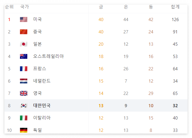 올해 대한민국은 금메달 13개 은메달 9개 동메달 10개(총 32개)로 8위의 성적으로 끝을 마쳤습니다.