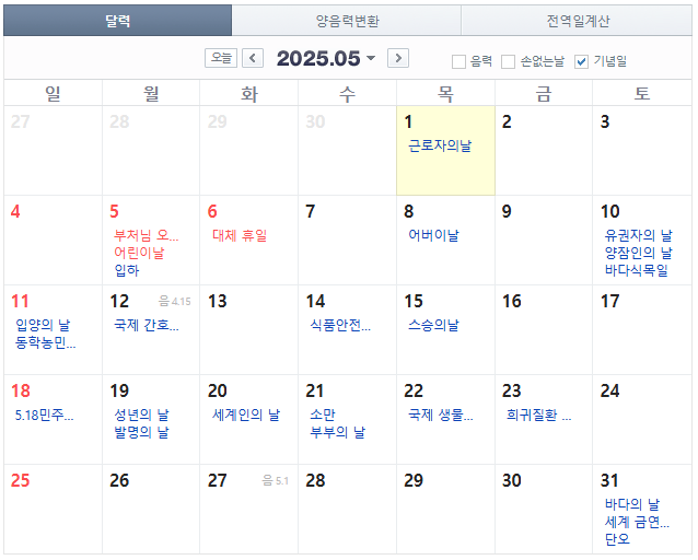 5월 1일의 경우에는 법정공휴일은 아니지만 근로자의 날이라 직장인 분들은 쉴 수가 있습니다.