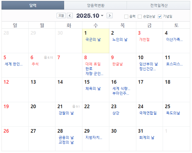 바로 개천절 ~ 추석 ~ 한글날이 이어집니다.