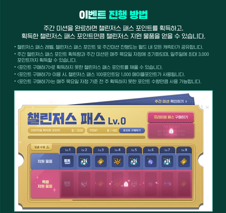 | 챌린저스 패스 | 프리미엄 패스 구매 시 데미지+경험치 증가, 성장템 보상 대량 획득 가능 |