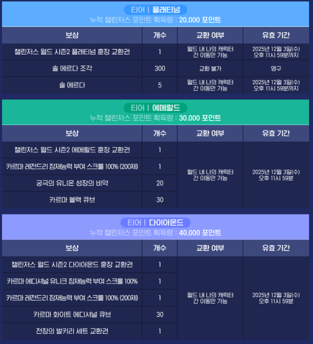 챌린저스 미션은 크게 일일, 레벨업, 보스 퇴치 세 가지로 나뉘며, 포인트를 쌓아 티어를 달성할 수 있어요. 각각의 티어는 보상도 어마어마하니 꼭 체크해야 해요!