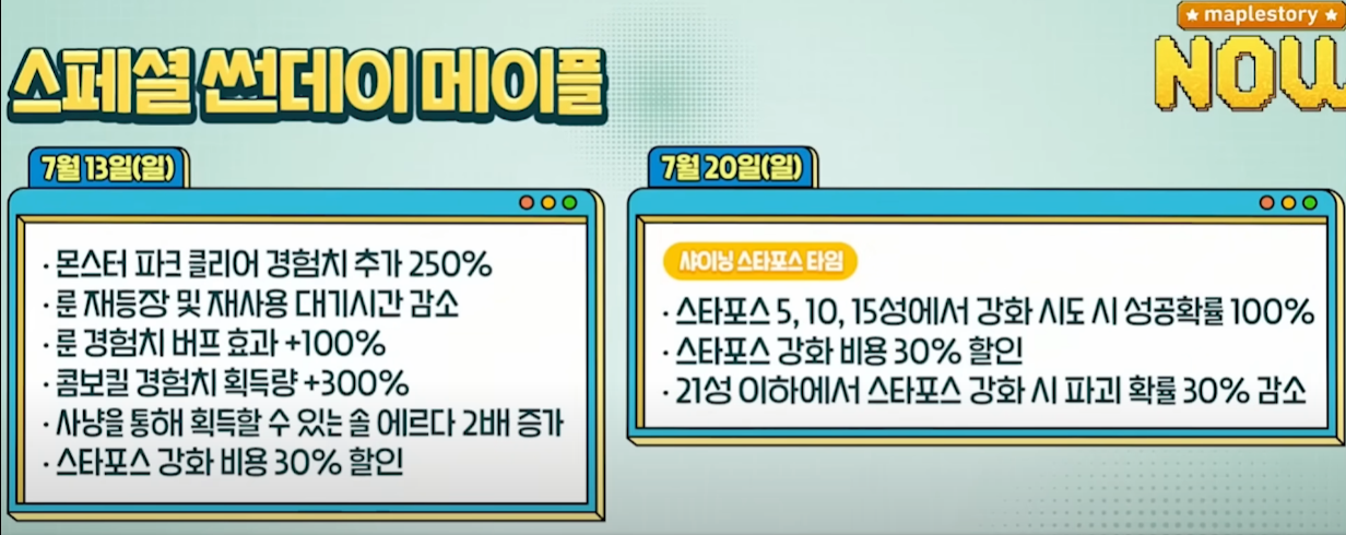 | 7월 13일 | 경험치 관련 이벤트 + 스타포스 강화 비용 30% 할인 |