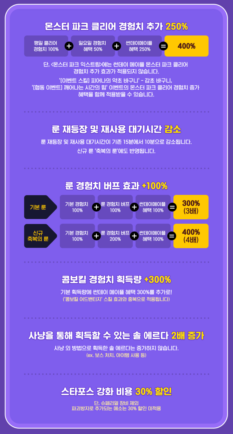 | 7월 13일 | 경험치 관련 이벤트 + 스타포스 강화 비용 30% 할인 |