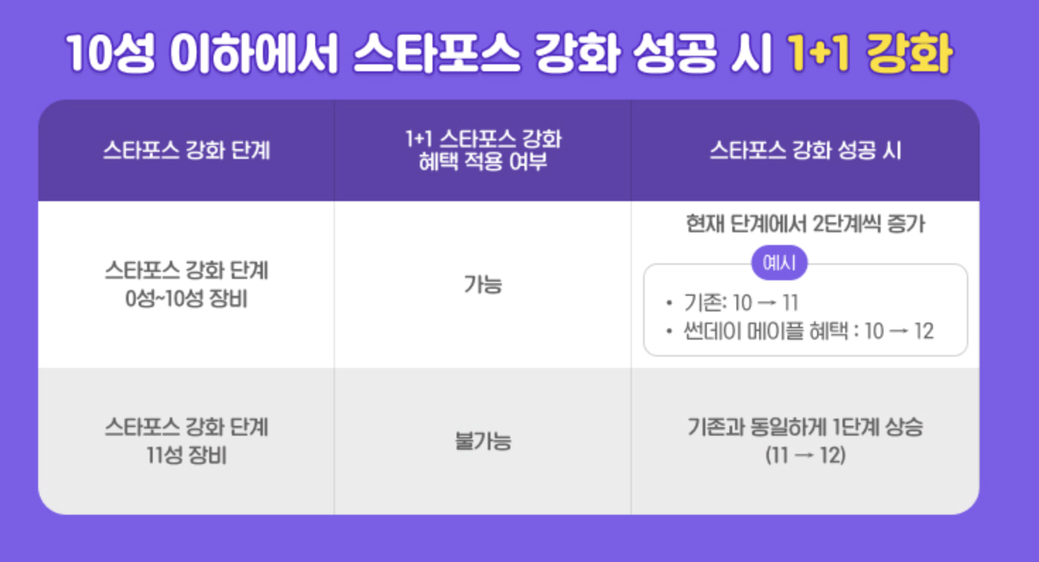- 스타포스 1+1: 10성 이하 구간 한정, 강화 성공 시 2성 증가