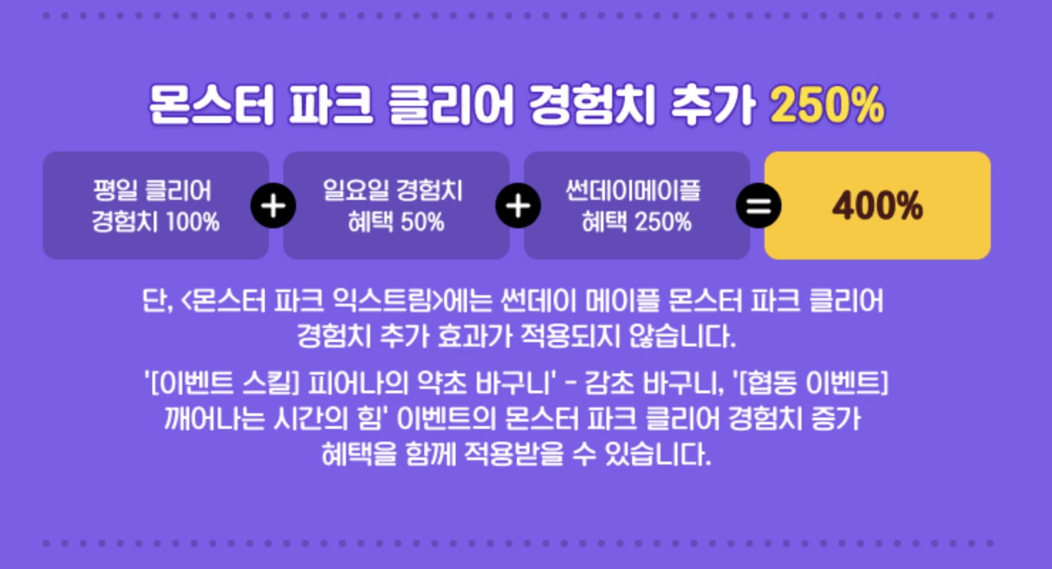 일요일 기본 경험치 50%에, 몬스터 파크 보너스 경험치 250%까지? 합치면 총 400%의 경험치를 받을 수 있다는 사실! 특히 몬스터 파크는 입장권만 있다면 누구나 손쉽게 클리어 가능한 콘텐츠라 더 매력적이에요. 게다가 1회는 무료 입장, 추가 6회는 포인트로 구매 가능하니 확실히 육성에 큰 도움이 되죠.