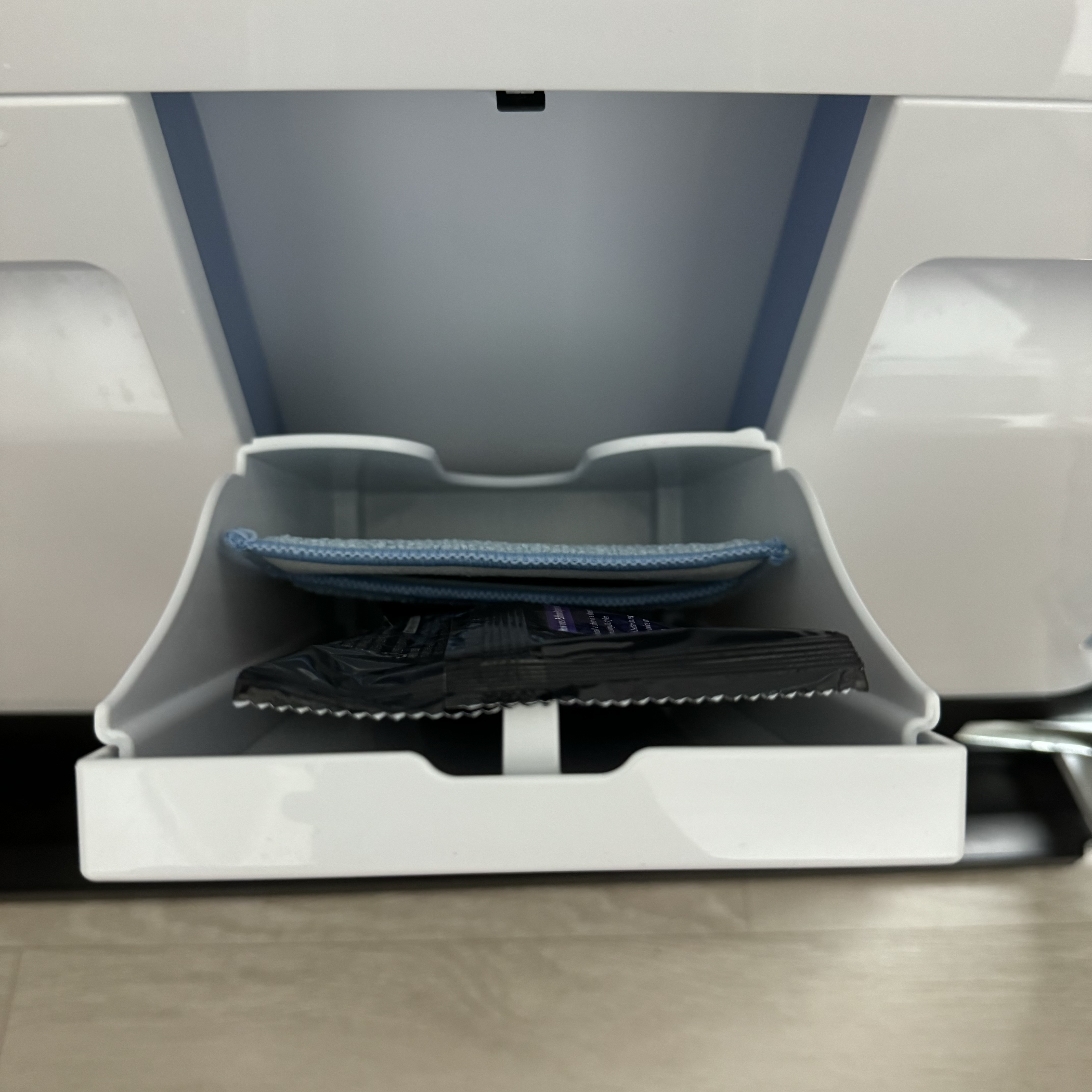 가운데 버튼은 따로 기능이 있는 것은 아니고, 아로마 시트나 먼지 제거를 할 때 쓰는 수건을 보관하는 용도라 스타일러에 필요한 제품들을 보관해주시면 되겠습니다.